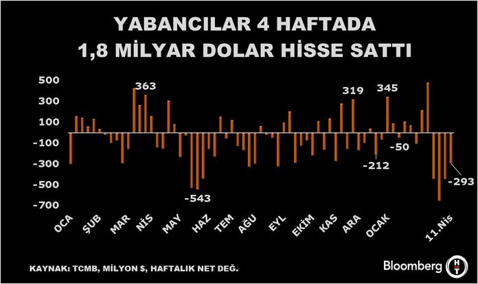 Türkiye Cumhuriyet Merkez Bankası’nın (TCMB) verilerine göre yabancı yatırımcılar 11 Nisan haftasında hisse ve tahvillerde 3,1 milyar dolarlık net satış yaptılar.