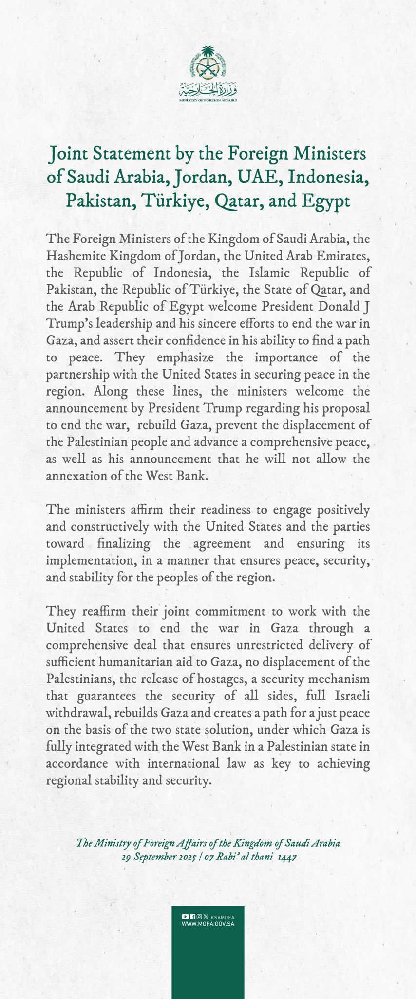 ▪️Açıklamada, ABD Başkanı Trump’ın Gazze’deki savaşı bitirmek, bölgeyi yeniden inşa etmek ve Filistinlilerin yerinden edilmesini önlemek için açıkladığı 20 maddelik plan memnuniyetle karşılandı.