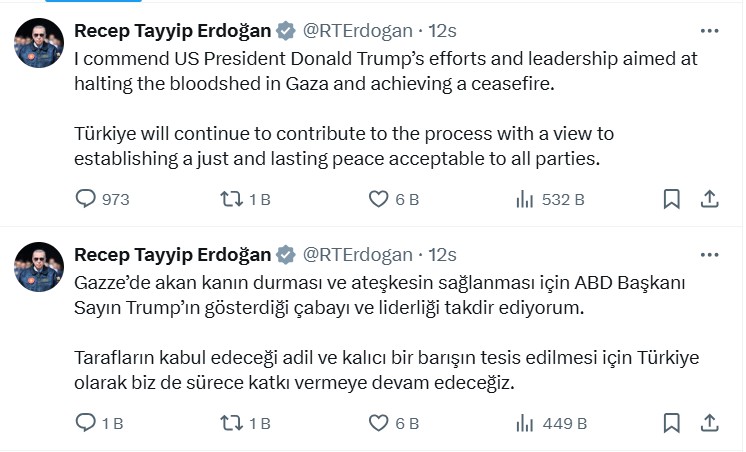 Bundan bir gün önce Cumhurbaşkanı Erdoğan da bir sosyal medya açıklamasıyla Trump’ın Gazze Planını destekleyici bir açıklama yapmıştı. Erdoğan’ın açıklaması şöyleydi: Gazze’de akan kanın durması ve ateşkesin sağlanması için ABD Başkanı Sayın Trump’ın gösterdiği çabayı ve liderliği takdir ediyorum.