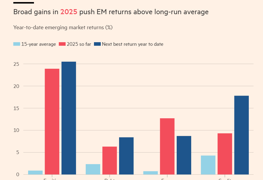 2025’in ilk aylarında yatırımcıların temkinli başladığı gelişen piyasalarda tablo hızla değişti. Zayıflayan dolar, güçlü makro politikalar ve emtia destekli bilançolar sayesinde para birimleri, hisse senetleri ve borçlanma araçları 2010’dan bu yana en iyi performanslarından birini sergiliyor. Ancak büyüme eksikliği hâlâ en önemli risk olarak görülüyor.