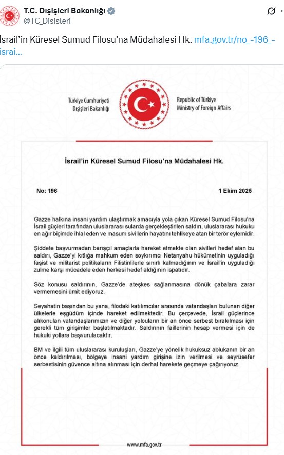 İsrail’in uygulamalarının uluslararası hukukun ve denizcilik güvenliğinin ağır ihlali anlamına geldiği vurgulanan açıklamada, Sumud Filosu’nun “tamamen insani yardım amacıyla yola çıktığı”nın altı çizildi.