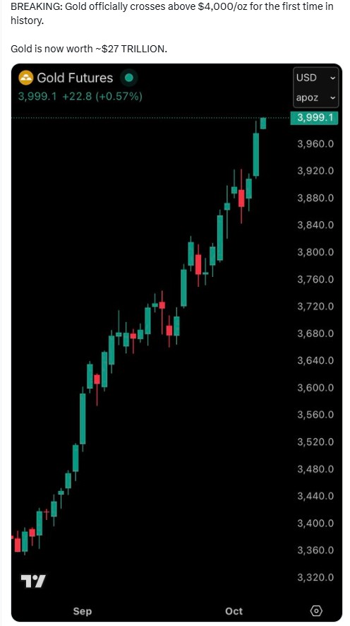 ABD’deki hükümet kapanması, zayıflayan dolar ve yaklaşan faiz indirimlerinin ardından altın 4.000 dolara dayandı ve yeni bir rekora imza attı.