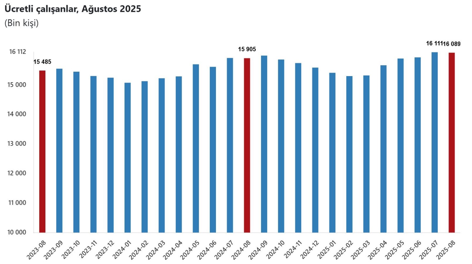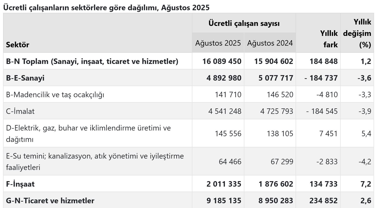 Ücretli çalışanların alt detaylarına bakıldığında; 2025 Ağustos ayında ücretli çalışan sayısı yıllık olarak sanayi sektöründe %3,6 azaldı, inşaat sektöründe %7,2 arttı ve ticaret-hizmet sektöründe %2,6 arttı.