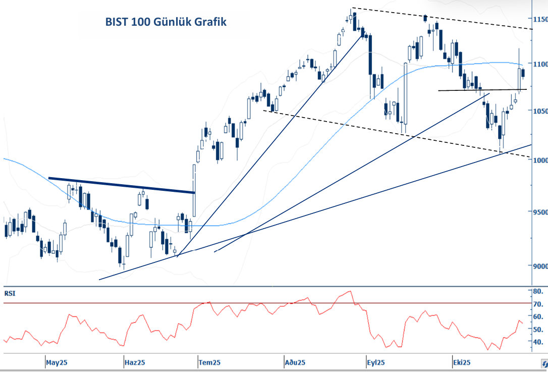 BIST 100 endeksi dün 10.823 – 10.948 aralığında işlem gördü ve günü %1,2 düşüşle 10.853 puanda tamamladı. Endeks, kısa ve orta vadeli ortalamalarının hafif üzerinde, 200 günlük ortalamanın ise belirgin biçimde üzerinde seyrediyor.
