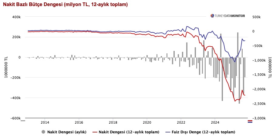 - Faiz Dışı Denge: Olumlu bir gelişme olarak, faiz dışı denge (faiz giderleri hariç gelir-gider dengesi) 36,0 milyar TL açık verse de, bir önceki yılın 41 milyar TL’lik açığına göre nominal olarak daralmıştır, bu da çekirdek harcamalarda kısmi bir mali disiplin sinyali vermektedir.