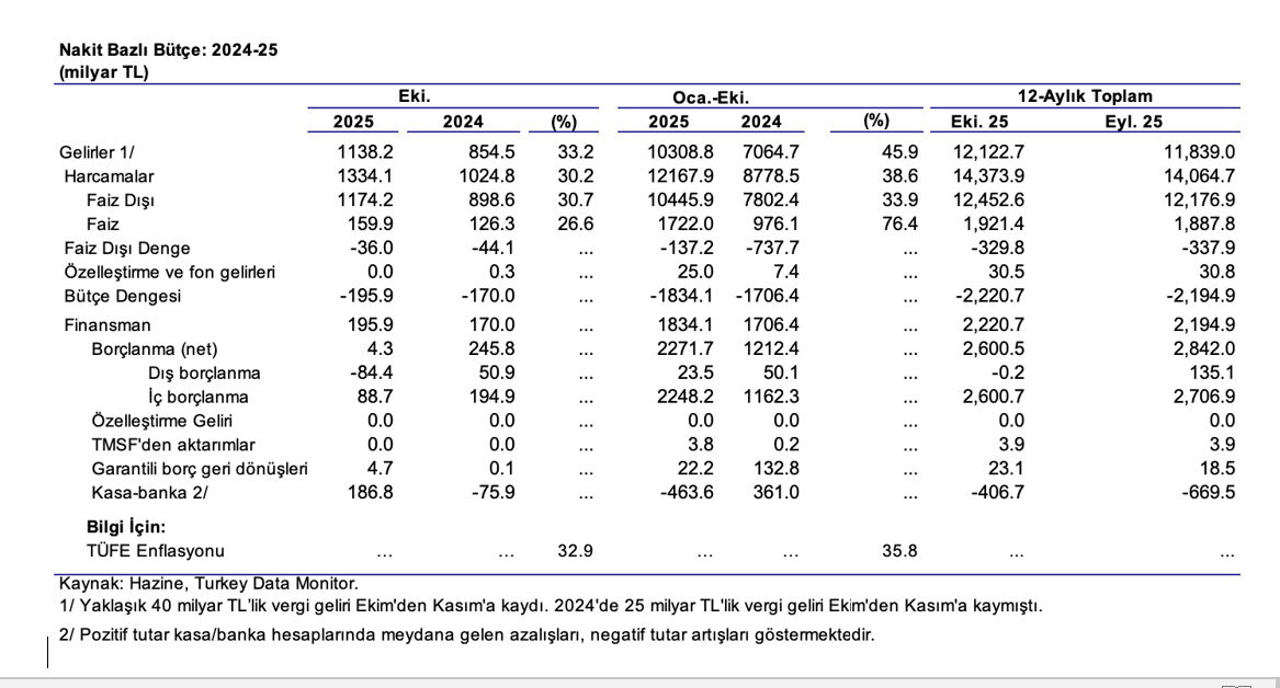 Ekim 2025’te yıllık Tüketici Fiyat Endeksi’nin (TÜFE) yaklaşık %32 olduğu varsayıldığında, bütçe performansının gerçek resmini görmek için nominal rakamların bu enflasyon oranına göre ayarlanması gerekmektedir: