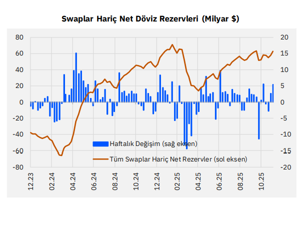 ➢ 5 Aralık haftasında brüt rezervler 183,2 milyar $’dan yaklaşık 3,2 milyar $ artışla 186,4 milyar $’a yükseldi. Aynı haftada net rezervler ise 72,1 milyar $’dan 5,5 milyar $ artış göstererek 77,6 milyar $’a yükseldi. Swap hariç net rezervler de yaklaşık 5,5 milyar $ artış (altın etkisi hariç 3,4 milyar $ artış) göstererek 63,2 milyar $’a yükseldi. Swap hariç net rezervlerin 2024 mart sonundaki dip seviyesi ise -65,5 milyar $, 14 Şubat 2025 tarihindeki zirve seviyesi ise 71 milyar $ olmuştu. İlgili haftada altın fiyatlarındaki artışın rezervlere yaklaşık 2 milyar $ pozitif etki yaptığını belirtmekte fayda var.